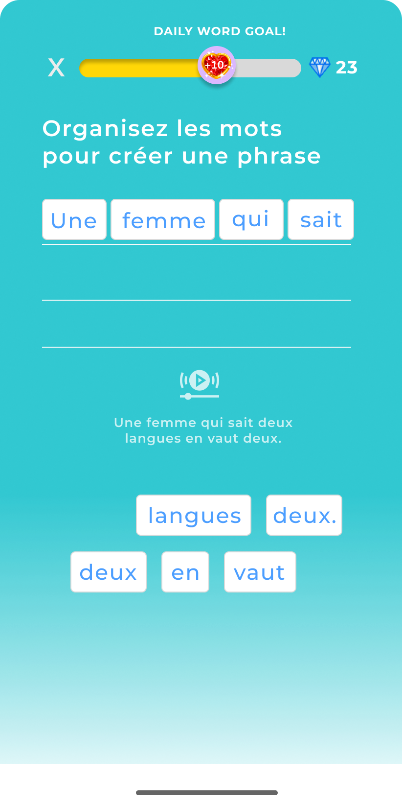 During a lesson, a user has just met their daily word bank goal and earned a reward: 10 Ling-gems, for use at the Ling-Shop.
