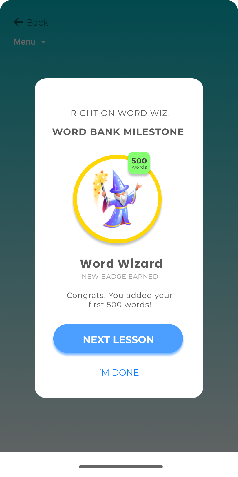 The user earned the Word Wizard badge for adding their first 500 words to their word bank. This is shown after the user completes a lesson.